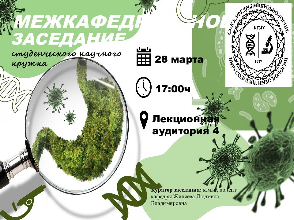 МЕЖКАФЕДРАЛЬНОЕ ЗАСЕДАНИЕ студенческого научного кружка Куратор заседания: к.м.н., доцент кафедры Жиляева Людмила Владимировна Лекционная аудитория 4 17:00ч 28 марта