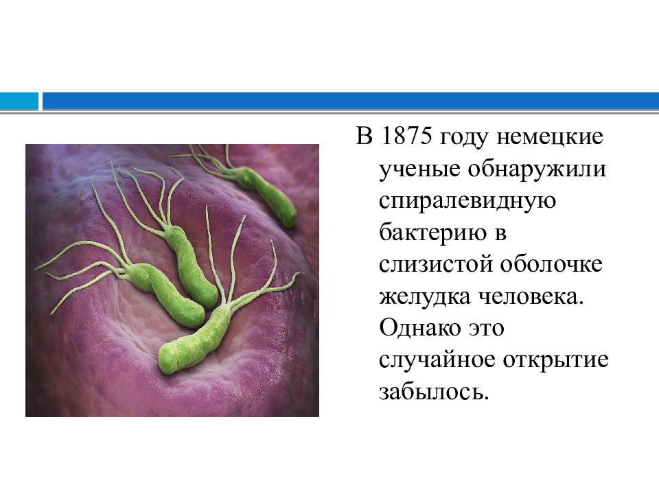 В 1875 году немецкие ученые обнаружили спиралевидную бактерию в слизистой оболочке желудка человека. Однако это случайное открытие забылось.