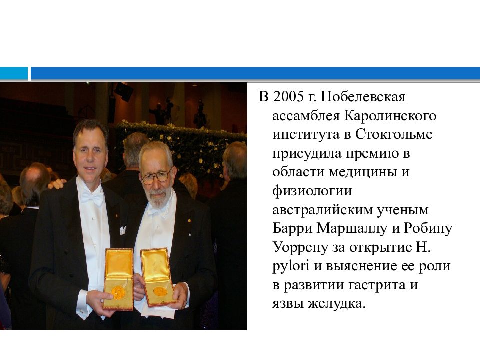 B 2005 г. Нобелевская ассамблея Каролинского института в Стокгольме присудила премию в области медицины и физиологии австралийским ученым Барри Маршаллу и Робину Уоррену за открытие Н. p ylori и выяснение ее роли в развитии гастрита и язвы желудка.