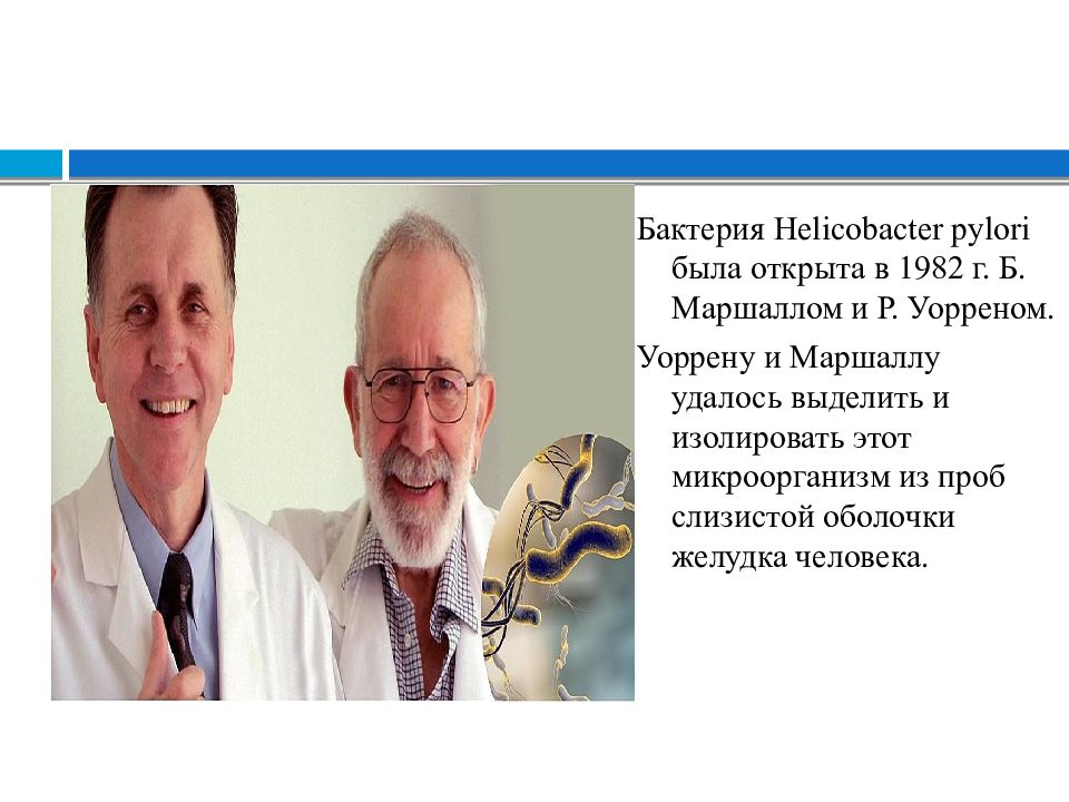 Бактерия Helicobacter pylori была открыта в 1982 г. Б. Маршаллом и Р. Уорреном. Уоррену и Маршаллу удалось выделить и изолировать этот микроорганизм из проб слизистой оболочки желудка человека.