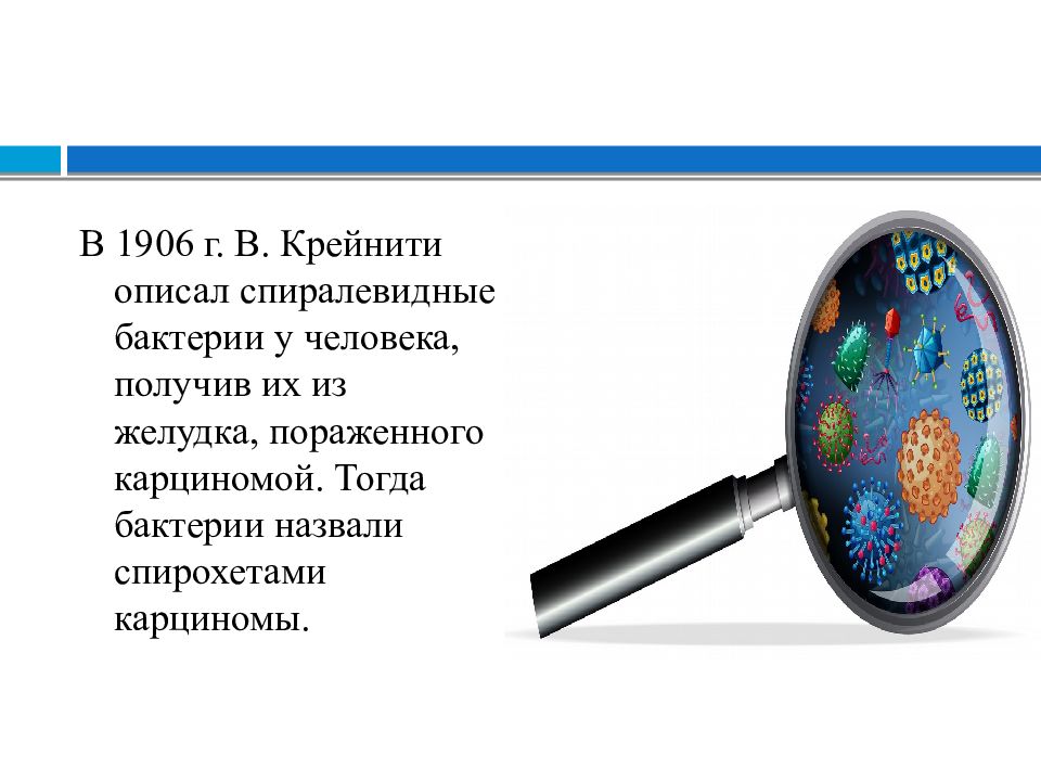 В 1906 г. В. Крейнити описал спиралевидные бактерии у человека, получив их из желудка, пораженного карциномой. Тогда бактерии назвали спирохетами карциномы.