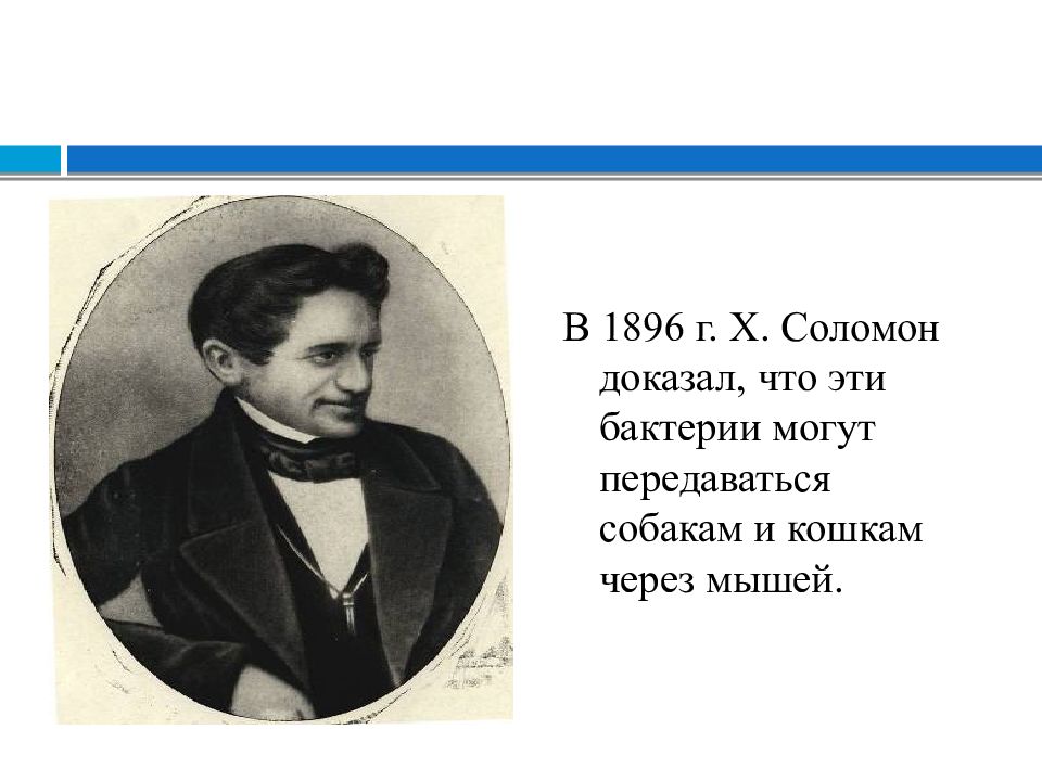 В 1896 г. Х. Соломон доказал, что эти бактерии могут передаваться собакам и кошкам через мышей.