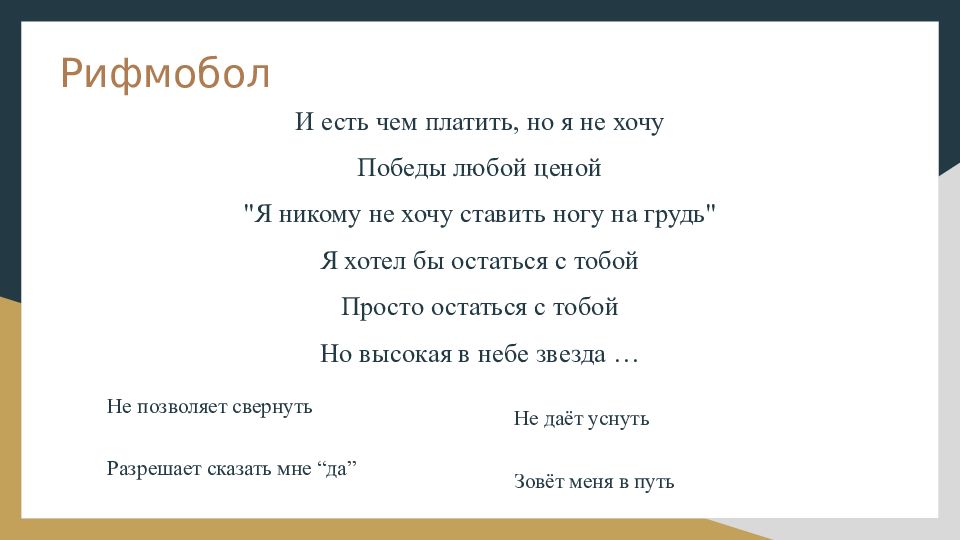 И есть чем платить, но я не хочу Победы любой ценой "Я никому не хочу ставить ногу на грудь" Я хотел бы остаться с тобой Просто остаться с тобой Но высокая в небе звезда … Не позволяет свернуть Не даёт уснуть Разрешает сказать мне “да” Зовёт меня в путь
