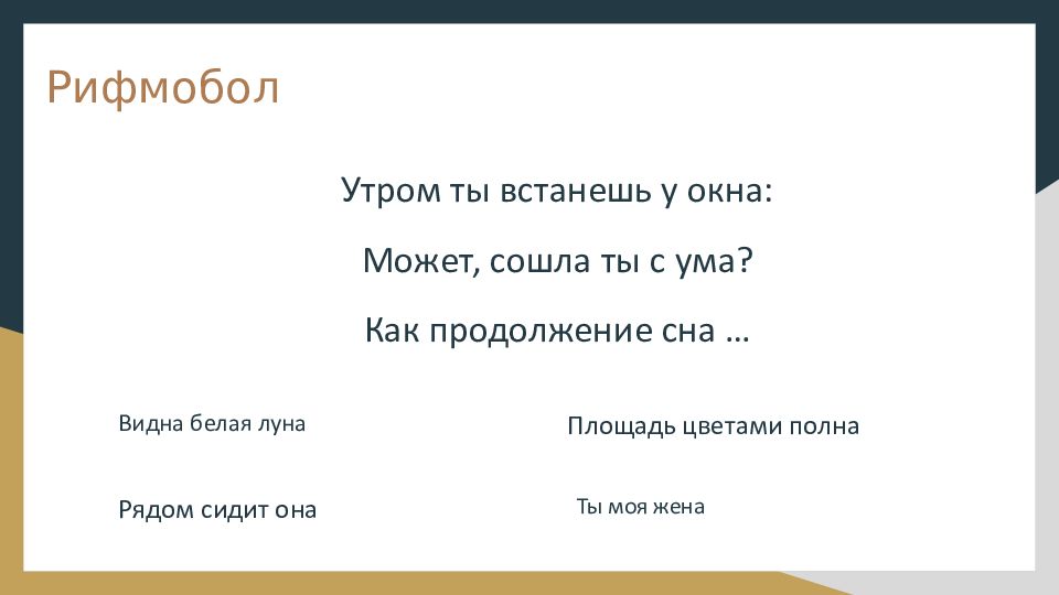Утром ты встанешь у окна: Может, сошла ты с ума? Как продолжение сна … Видна белая луна Площадь цветами полна Рядом сидит она Ты моя жена