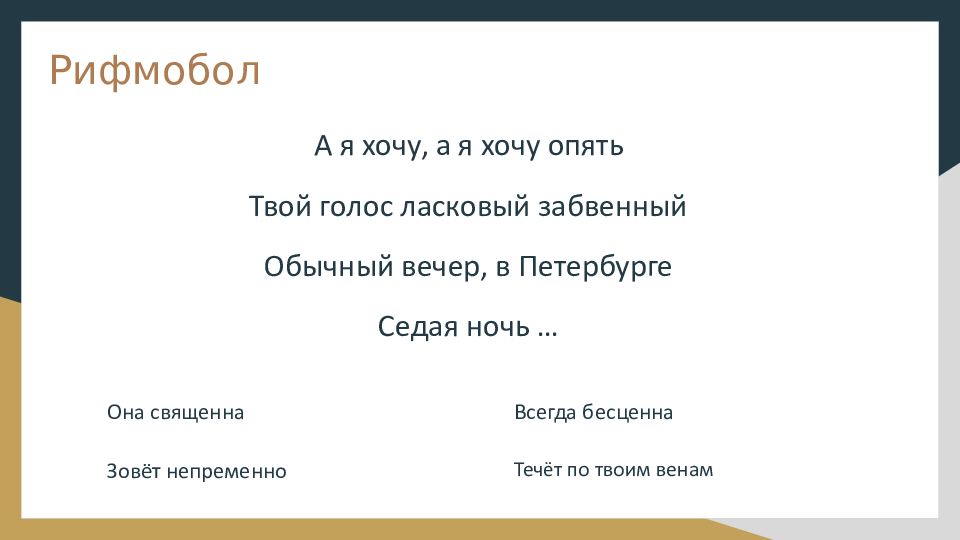 А я хочу, а я хочу опять Твой голос ласковый забвенный Обычный вечер, в Петербурге Седая ночь … Она священна Всегда бесценна Зовёт непременно Течёт по твоим венам