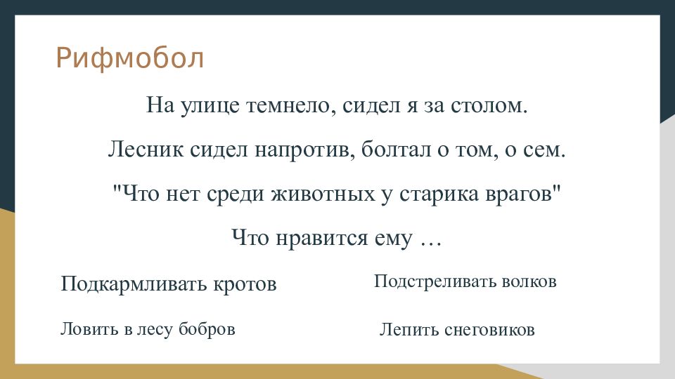 На улице темнело, сидел я за столом. Лесник сидел напротив, болтал о том, о сем. "Что нет среди животных у старика врагов" Что нравится ему … Подкармливать кротов Подстреливать волков Лепить снеговиков Ловить в лесу бобров