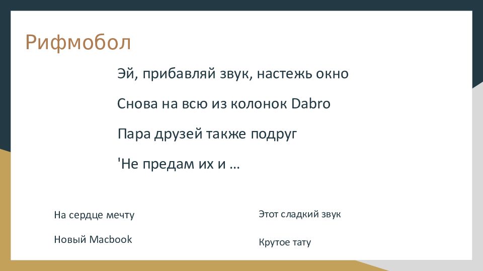 Эй, прибавляй звук, настежь окно Снова на всю из колонок Dabro Пара друзей также подруг 'Не предам их и … На сердце мечту Этот сладкий звук Новый Macbook Крутое тату