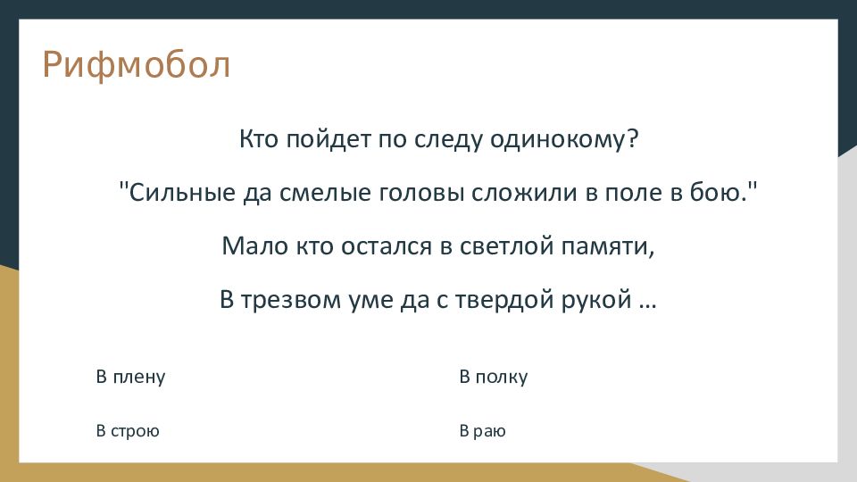 Кто пойдет по следу одинокому? "Сильные да смелые головы сложили в поле в бою." Мало кто остался в светлой памяти, В трезвом уме да с твердой рукой … В плену В полку В строю В раю