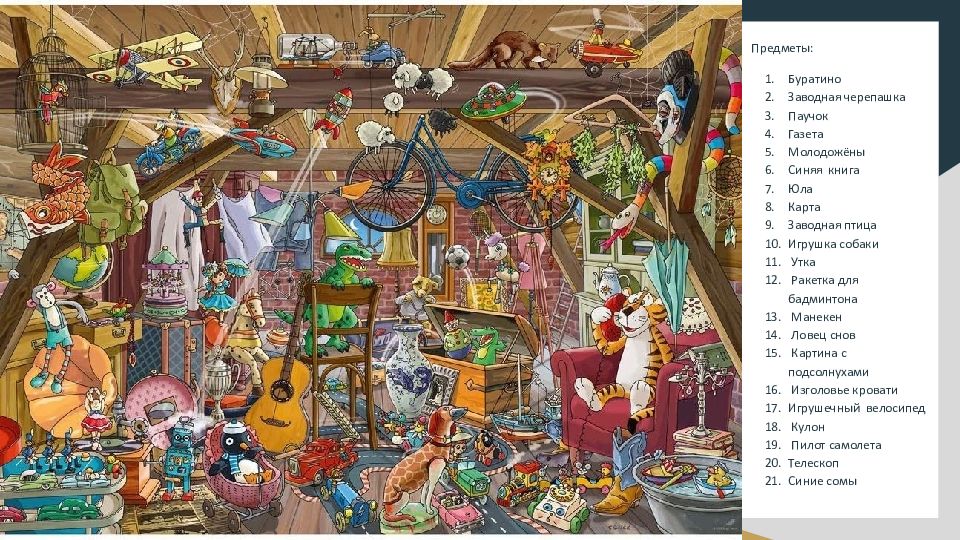 Предметы: Буратино Заводная черепашка Паучок Газета Молодожёны Синяя книга Юла Карта Заводная птица Игрушка собаки Утка Ракетка для бадминтона Манекен Ловец снов Картина с подсолнухами Изголовье кровати Игрушечный велосипед Кулон Пилот самолета Телескоп Синие сомы