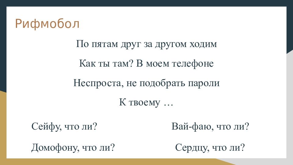 По пятам друг за другом ходим Как ты там? В моем телефоне Неспроста, не подобрать пароли К твоему … Сердцу, что ли? Домофону, что ли? Сейфу, что ли? Вай-фаю, что ли?