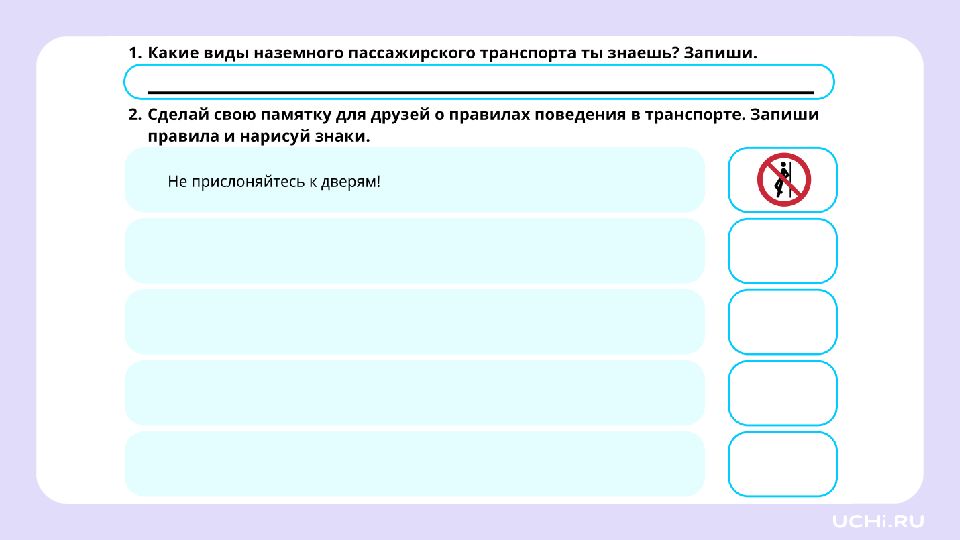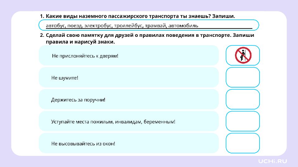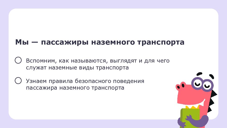 Мы — пассажиры наземного транспорта Вспомним, как называются, выглядят и для чего служат наземные виды транспорта Узнаем правила безопасного поведения пассажира наземного транспорта
