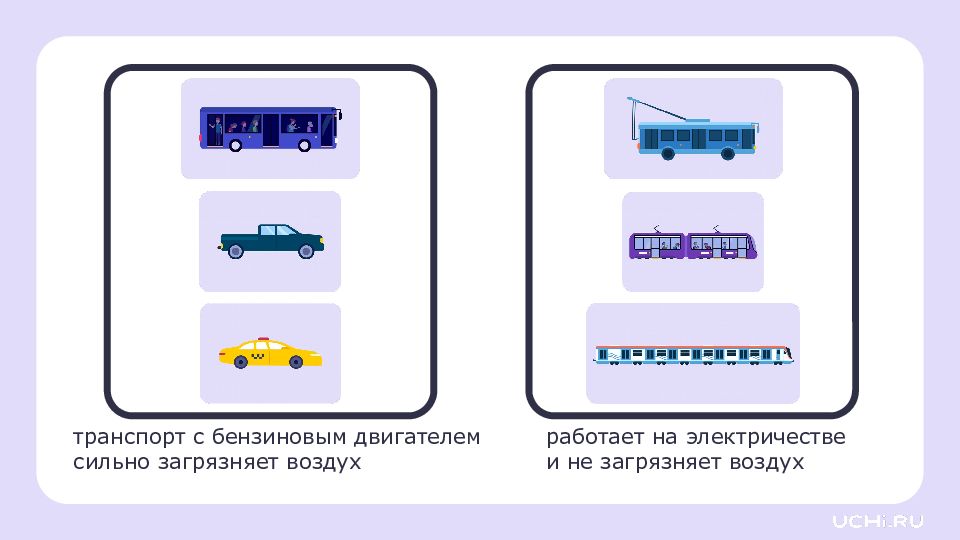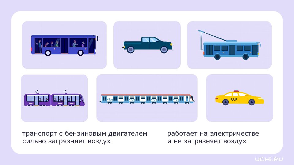 транспорт с бензиновым двигателем сильно загрязняет воздух работает на электричестве и не загрязняет воздух