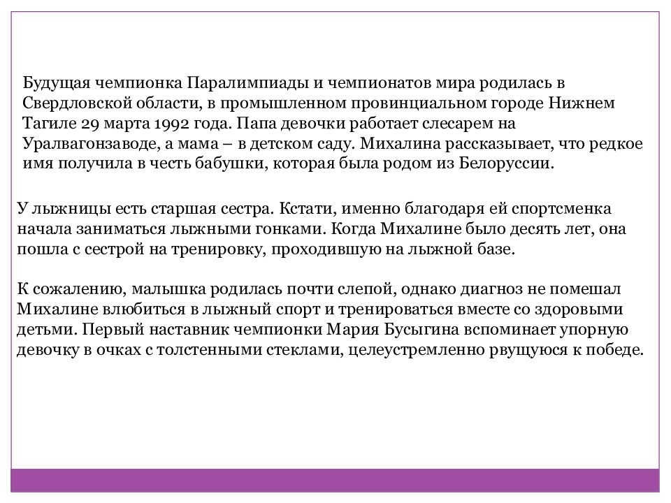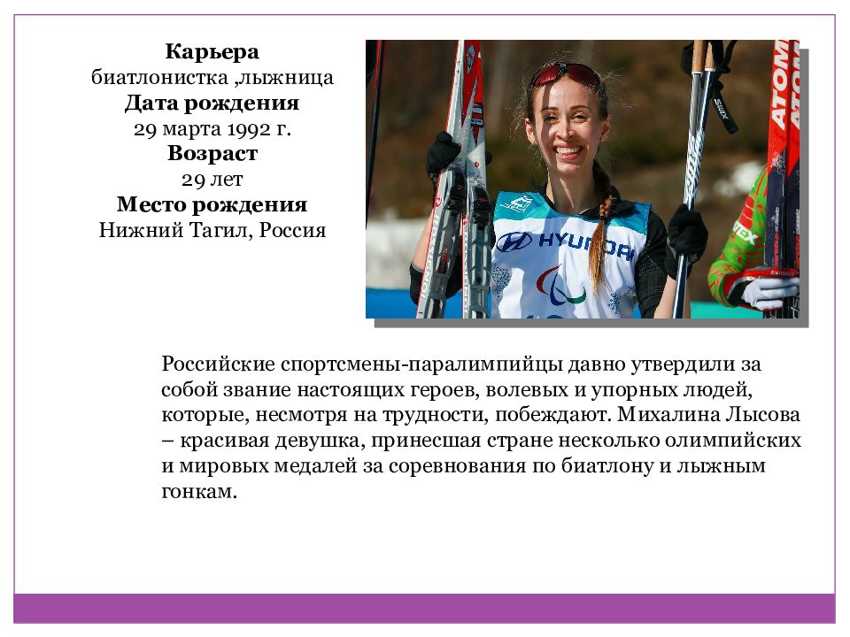 Карьера биатлонистка,лыжница Дата рождения 29 марта 1992 г. Возраст 29 лет Место рождения Нижний Тагил, Россия Российские спортсмены-паралимпийцы давно утвердили за собой звание настоящих героев, волевых и упорных людей, которые, несмотря на трудности, побеждают. Михалина Лысова – красивая девушка, принесшая стране несколько олимпийских и мировых медалей за соревнования по биатлону и лыжным гонкам.
