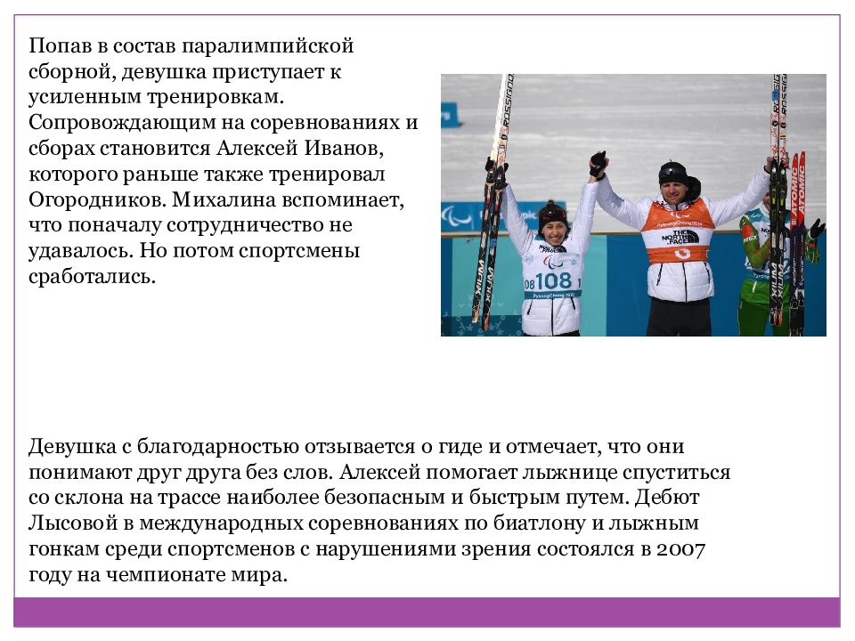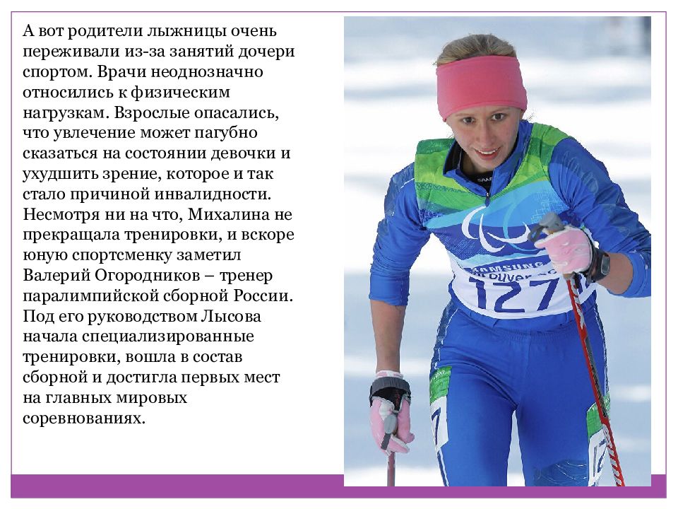 А вот родители лыжницы очень переживали из-за занятий дочери спортом. Врачи неоднозначно относились к физическим нагрузкам. Взрослые опасались, что увлечение может пагубно сказаться на состоянии девочки и ухудшить зрение, которое и так стало причиной инвалидности. Несмотря ни на что, Михалина не прекращала тренировки, и вскоре юную спортсменку заметил Валерий Огородников – тренер паралимпийской сборной России. Под его руководством Лысова начала специализированные тренировки, вошла в состав сборной и достигла первых мест на главных мировых соревнованиях.
