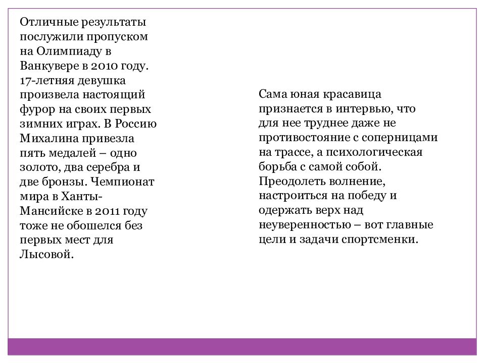 Отличные результаты послужили пропуском на Олимпиаду в Ванкувере в 2010 году. 17-летняя девушка произвела настоящий фурор на своих первых зимних играх. В Россию Михалина привезла пять медалей – одно золото, два серебра и две бронзы. Чемпионат мира в Ханты-Мансийске в 2011 году тоже не обошелся без первых мест для Лысовой. Сама юная красавица признается в интервью, что для нее труднее даже не противостояние с соперницами на трассе, а психологическая борьба с самой собой. Преодолеть волнение, настроиться на победу и одержать верх над неуверенностью – вот главные цели и задачи спортсменки.
