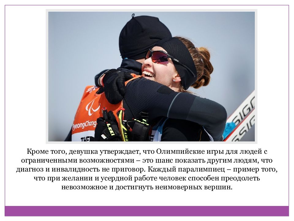 Кроме того, девушка утверждает, что Олимпийские игры для людей с ограниченными возможностями – это шанс показать другим людям, что диагноз и инвалидность не приговор. Каждый паралимпиец – пример того, что при желании и усердной работе человек способен преодолеть невозможное и достигнуть неимоверных вершин.