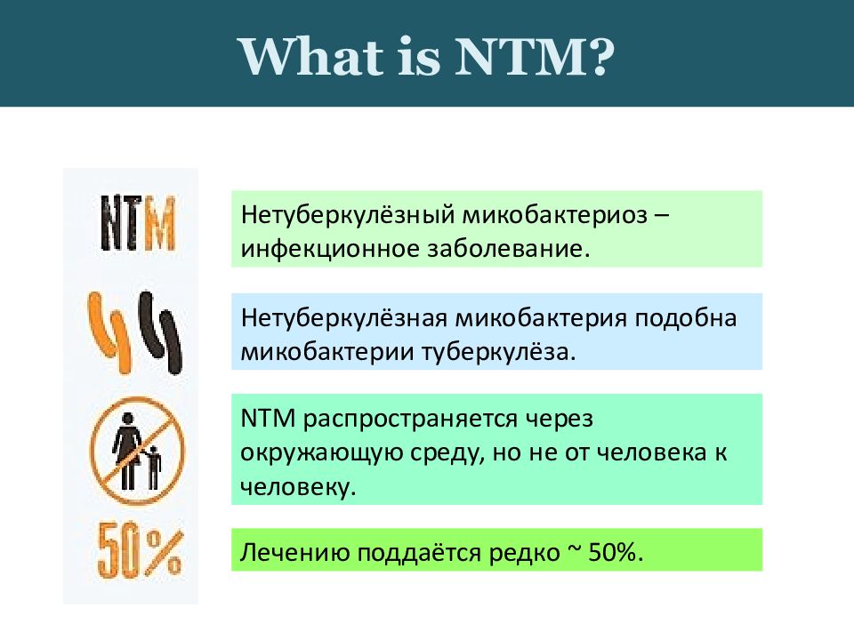 Нетуберкулёзный микобактериоз – инфекционное заболевание. What is NTM ? Нетуберкулёзная микобактерия подобна микобактерии туберкулёза. NTM распространяется через окружающую среду, но не от человека к человеку. Лечению поддаётся редко ~ 50%.