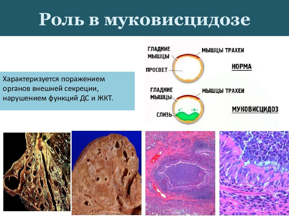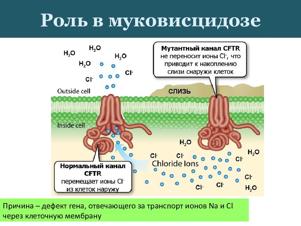 Роль в муковисцидозе Причина – дефект гена, отвечающего за транспорт ионов Na и Cl через клеточную мембрану