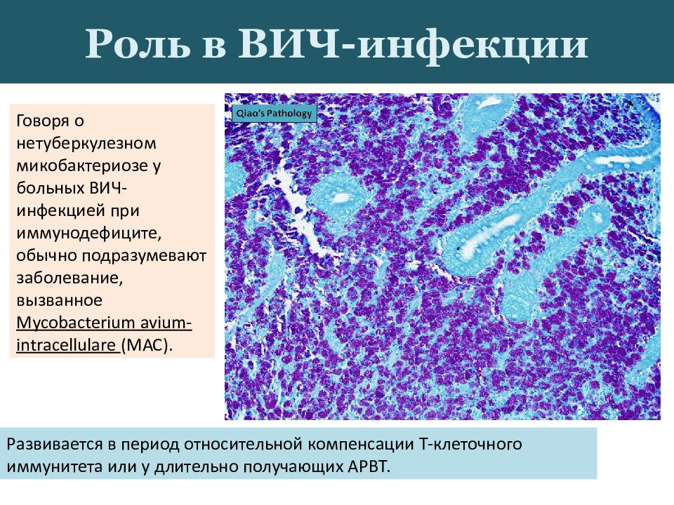 Говоря о нетуберкулезном микобактериозе у больных ВИЧ‐инфекцией при иммунодефиците, обычно подразумевают заболевание, вызванное Mycobacterium avium‐intracellulare (МАС ). Роль в ВИЧ-инфекции Развивается в период относительной компенсации Т‐клеточного иммунитета или у длительно получающих АРВТ.