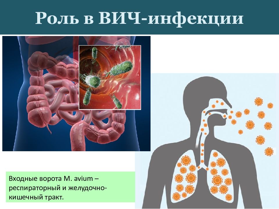 Роль в ВИЧ-инфекции Входные ворота М. avium –респираторный и желудочно-кишечный тракт.