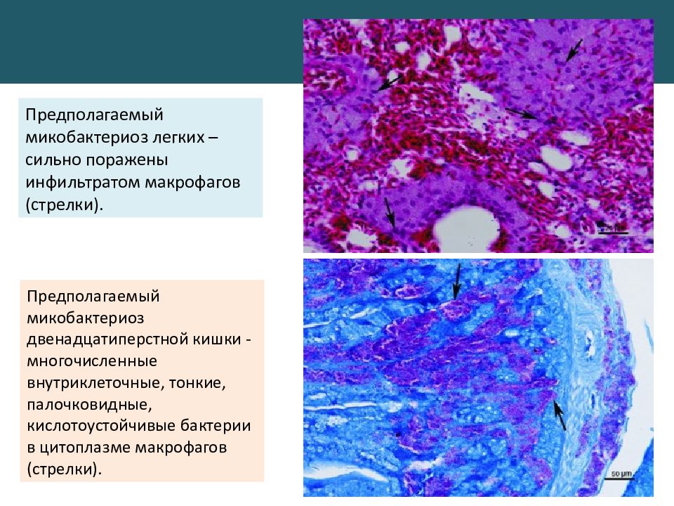 Предполагаемый микобактериоз двенадцатиперстной кишки - многочисленные внутриклеточные, тонкие, палочковидные, кислотоустойчивые бактерии в цитоплазме макрофагов (стрелки ). Предполагаемый микобактериоз легких –сильно поражены инфильтратом макрофагов (стрелки ).