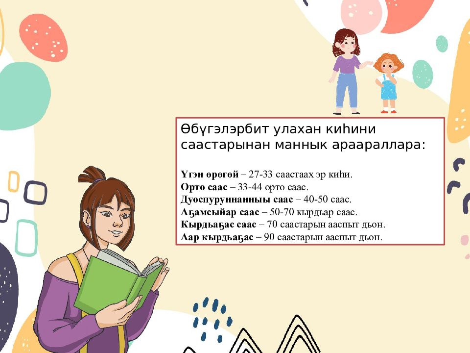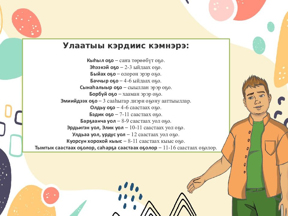 Улаатыы кэрдиис кэмнэрэ : Кыhыл оҕо – саҥа төрөөбүт оҕо. Эhээкэй оҕо – 2-3 ыйдаах оҕо. Быйах оҕо – олорон эрэр оҕо. Баччыр оҕо – 4-6 ыйдаах оҕо. Сынаhалыыр оҕо – сыыллан эрэр оҕо. Борбуй оҕо – хааман эрэр оҕо. Эмиийдээх оҕо – 3 сааһыгар диэри оҕону ааттыыллар. Олдьу оҕо – 4-6 саастаах оҕо. Бэдик оҕо – 7-11 саастаах оҕо. Барҕаанча уол – 8-9 саастаах уол оҕо. Эрдьигэн уол, Элик уол – 10-11 саастаах уол оҕо. Улдьаа уол, урдус уол – 12 саастаах уол оҕо. Куорсун хорохой кыыс – 8-11 саастаах кыыс оҕо. Тымтык саастаах оҕолор, саhарҕа саастаах оҕолор – 11-16 саастаах оҕолор.