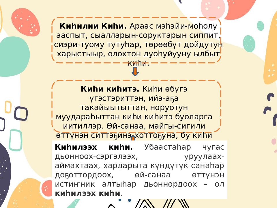 Киһилии Киһи. Араас мэһэйи-моһолу ааспыт, сыалларын-соруктарын сиппит, сиэри-туому тутуһар, төрөөбүт дойдутун харыстыыр, олохтон дуоһуйууну ылбыт киһи. Киһи киһитэ. Киһи өбүгэ үгэстэриттэн, ийэ-аҕа такайыытыттан, норуотун муудараһыттан киһи киһитэ буоларга иитиллэр. Өй-санаа, майгы-сигили өттүнэн ситтэҕинэ-хоттоҕуна, бу киһи иэһин төлүөхтээх. Киһилээх киһи. Убаастаһар чугас дьонноох-сэргэлээх, уруулаах-аймахтаах, хардарыта күндүтүк санаһар доҕоттордоох, өй-санаа өттүнэн истиҥник алтыһар дьоннордоох – ол киһилээх киһи.