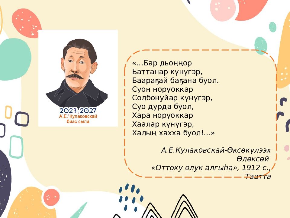 «...Бар дьоңңор Баттанар күнүгэр, Баараҕай баҕана буол. Суон норуоккар Солбонуйар күнүгэр, Суо дурда буол, Хара норуоккар Хаалар күнүгэр, Халың хахха буол!...» А.Е.Кулаковскай-Өксөкүлээх Өлөксөй «Оттоку олук алгыһа», 1912 с., Таатта