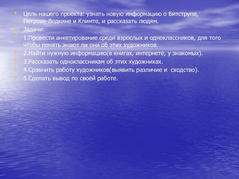 Цель нашего проекта: узнать новую информацию о Битструпе, Петрове-Водкине и Климте, и рассказать людям. Задачи: 1.Провести анкетирование среди взрослых и одноклассников, для того чтобы понять знают ли они об этих художников. 2.Найти нужную информацию(в книгах, интернете, у знакомых). 3.Рассказать одноклассникам об этих художниках. 4.Сравнить работу художников(выявить различие и сходство). 5.Сделать вывод по своей работе.