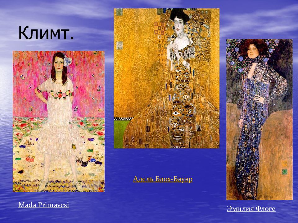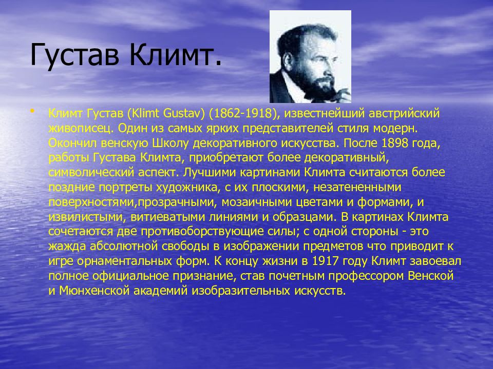 Климт Густав ( Klimt Gustav ) (1862-1918), известнейший австрийский живописец. Один из самых ярких представителей стиля модерн. Окончил венскую Школу декоративного искусства. После 1898 года, работы Густава Климта, приобретают более декоративный, символический аспект. Лучшими картинами Климта считаются более поздние портреты художника, с их плоскими, незатененными поверхностями,прозрачными, мозаичными цветами и формами, и извилистыми, витиеватыми линиями и образцами. В картинах Климта сочетаются две противоборствующие силы; с одной стороны - это жажда абсолютной свободы в изображении предметов что приводит к игре орнаментальных форм. К концу жизни в 1917 году Климт завоевал полное официальное признание, став почетным профессором Венской и Мюнхенской академий изобразительных искусств.