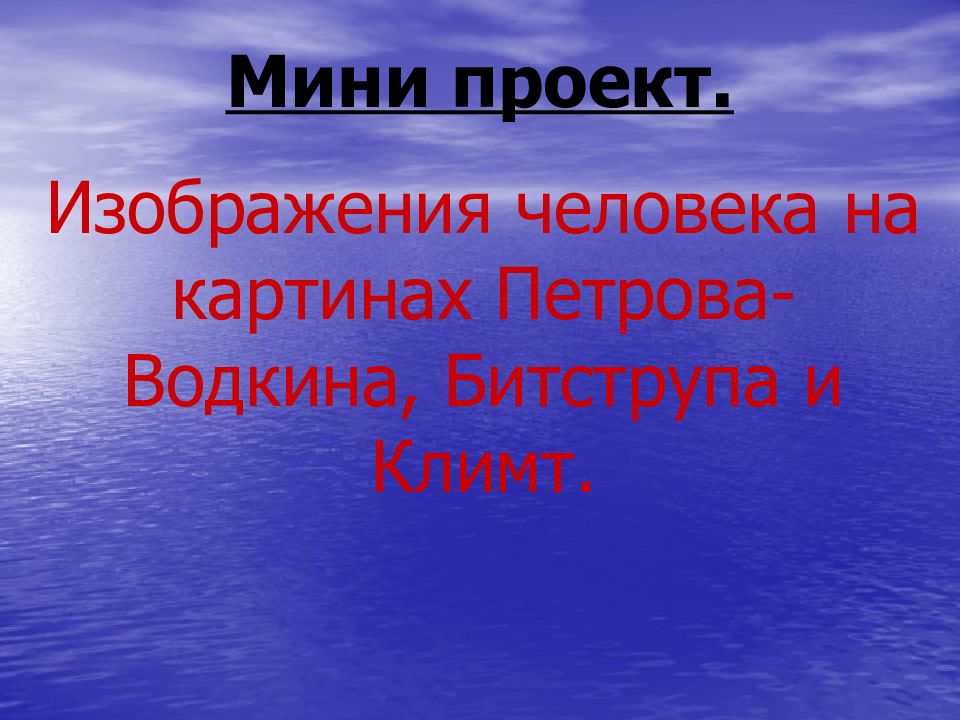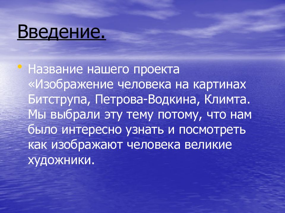Название нашего проекта «Изображение человека на картинах Битструпа, Петрова-Водкина, Климта. Мы выбрали эту тему потому, что нам было интересно узнать и посмотреть как изображают человека великие художники.