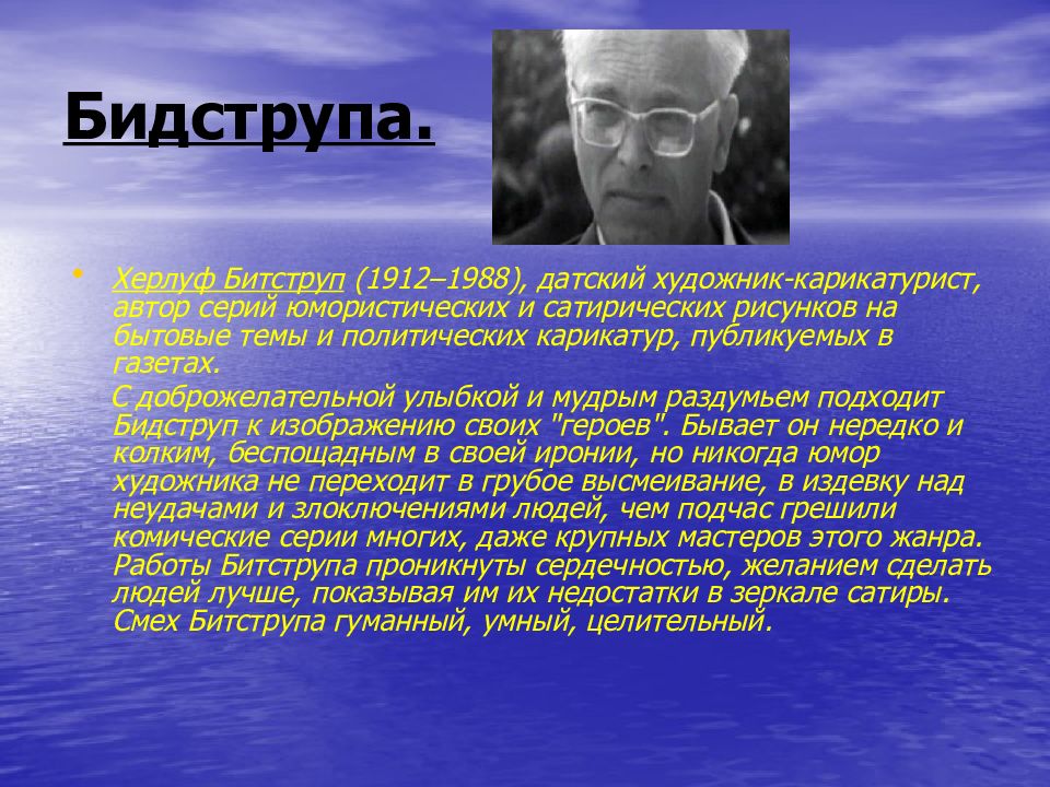 Херлуф Битструп (1912–1988), датский художник-карикатурист, автор серий юмористических и сатирических рисунков на бытовые темы и политических карикатур, публикуемых в газетах. С доброжелательной улыбкой и мудрым раздумьем подходит Бидструп к изображению своих "героев". Бывает он нередко и колким, беспощадным в своей иронии, но никогда юмор художника не переходит в грубое высмеивание, в издевку над неудачами и злоключениями людей, чем подчас грешили комические серии многих, даже крупных мастеров этого жанра. Работы Битструпа проникнуты сердечностью, желанием сделать людей лучше, показывая им их недостатки в зеркале сатиры. Смех Битструпа гуманный, умный, целительный.