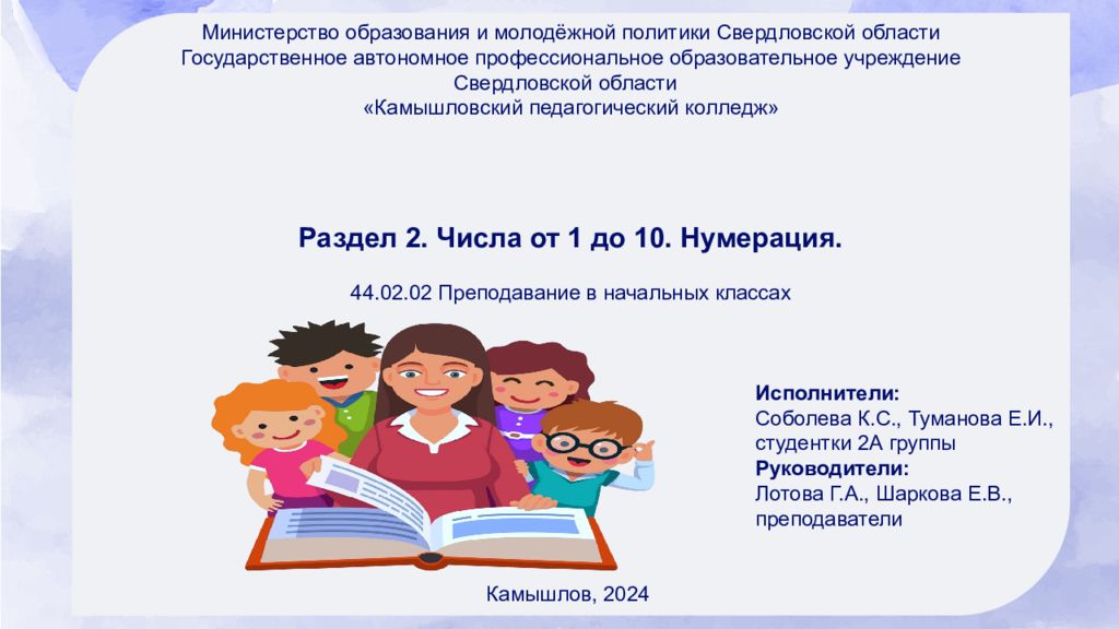 Министерство образования и молодёжной политики Свердловской области Государственное автономное профессиональное образовательное учреждение Свердловской области « Камышловский педагогический колледж» Раздел 2. Числа от 1 до 10. Нумерация. 44.02.02 Преподавание в начальных классах Исполнители: Соболева К.С., Туманова Е.И., студентки 2А группы Руководители: Лотова Г.А., Шаркова Е.В., преподаватели Камышлов, 2024