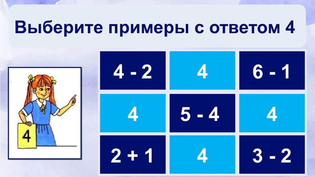 Выберите примеры с ответом 4 4 - 2 3 + 1 6 - 1 5 - 1 5 - 4 1 + 3 2 + 1 2 + 2 3 - 2 4 4 4 4