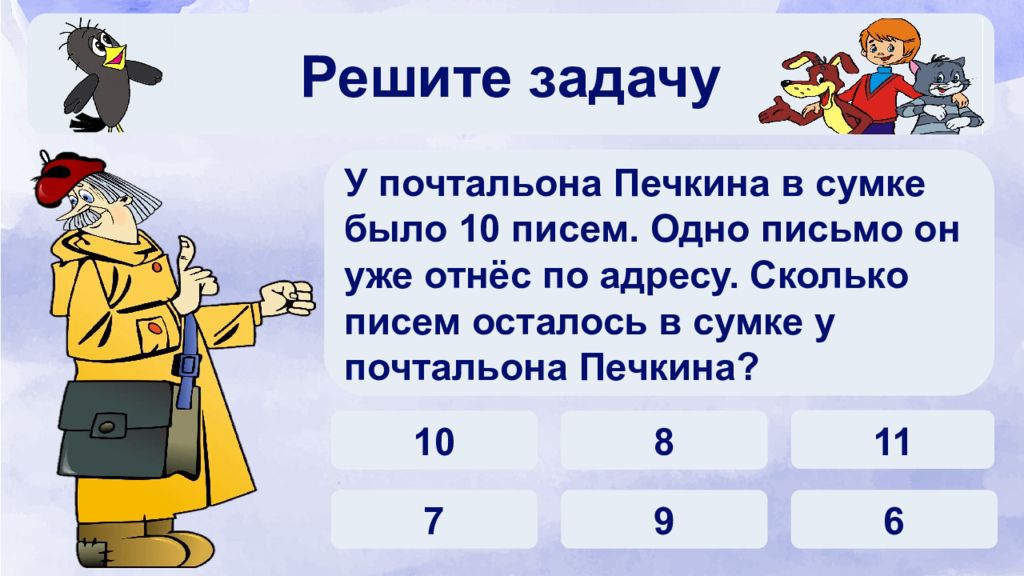 Решите задачу У почтальона Печкина в сумке было 10 писем. Одно письмо он уже отнёс по адресу. Сколько писем осталось в сумке у почтальона Печкина? 10 8 11 7 9 6