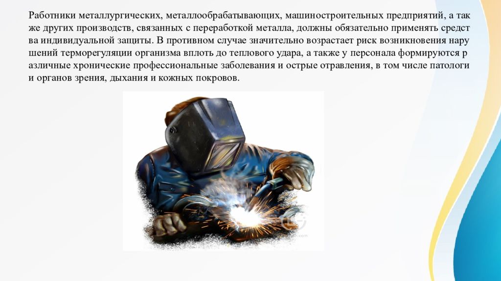 Слайд 8: Работники металлургических, металлообрабатывающих, машиностроительных предприятий, а также других производств, связанных с переработкой металла, должны обязательно применять средства индивидуальной защиты. В противном случае значительно возрастает риск возникновения нарушений терморегуляции организма вплоть до теплового удара, а также у персонала формируются различные хронические профессиональные заболевания и острые отравления, в том числе патологии органов зрения, дыхания и кожных покровов
