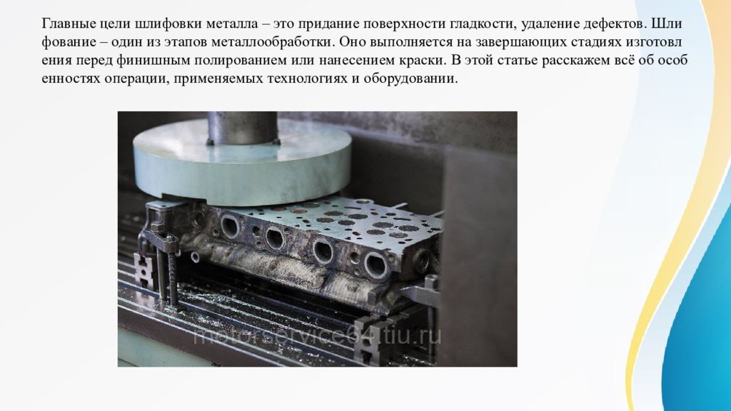 Слайд 7: Главные цели шлифовки металла – это придание поверхности гладкости, удаление дефектов. Шлифование – один из этапов металлообработки. Оно выполняется на завершающих стадиях изготовления перед финишным полированием или нанесением краски. В этой статье расскажем всё об особенностях операции, применяемых технологиях и оборудовании