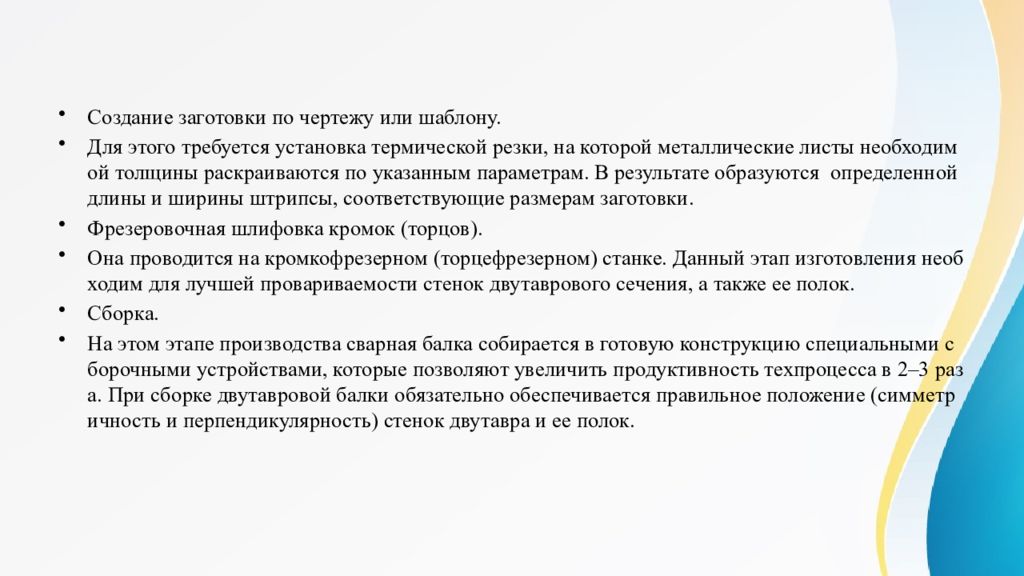 Создание заготовки по чертежу или шаблону. Для этого требуется установка термической резки, на которой металлические листы необходимой толщины раскраиваются по указанным параметрам. В результате образуются определенной длины и ширины штрипсы, соответствующие размерам заготовки. Фрезеровочная шлифовка кромок (торцов). Она проводится на кромкофрезерном (торцефрезерном) станке. Данный этап изготовления необходим для лучшей провариваемости стенок двутаврового сечения, а также ее полок. Сборка. На этом этапе производства сварная балка собирается в готовую конструкцию специальными сборочными устройствами, которые позволяют увеличить продуктивность техпроцесса в 2–3 раза. При сборке двутавровой балки обязательно обеспечивается правильное положение (симметричность и перпендикулярность) стенок двутавра и ее полок.