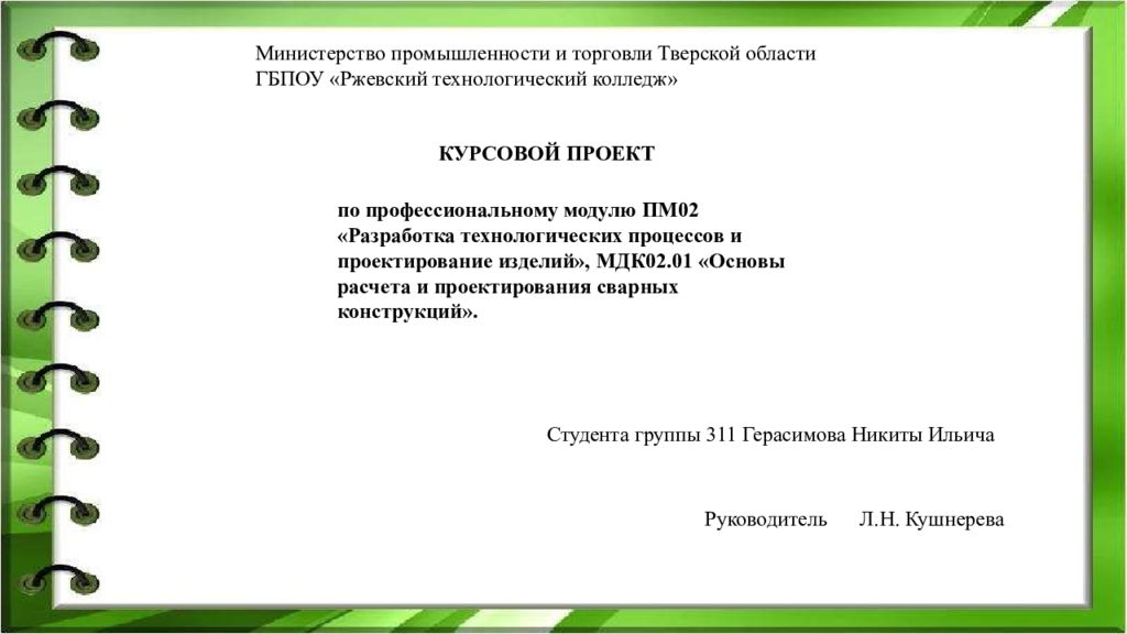 Министерство промышленности и торговли Тверской области ГБПОУ «Ржевский технологический колледж» КУРСОВОЙ ПРОЕКТ по профессиональному модулю ПМ02 «Разработка технологических процессов и проектирование изделий», МДК02.01 «Основы расчета и проектирования сварных конструкций». Студента группы 311 Герасимова Никиты Ильича Руководитель Л.Н. Кушнерева