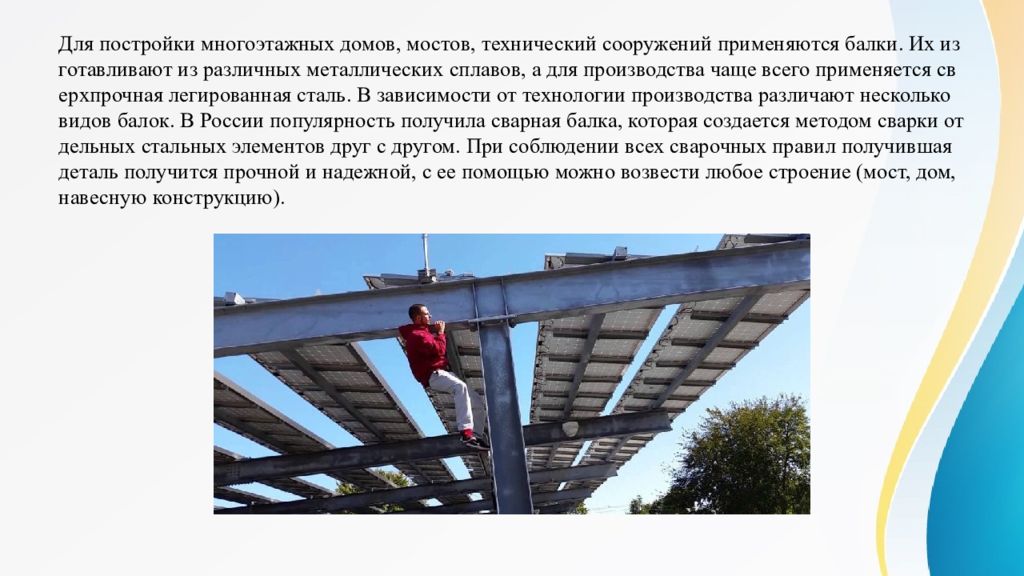 Слайд 4: Для постройки многоэтажных домов, мостов, технический сооружений применяются балки. Их изготавливают из различных металлических сплавов, а для производства чаще всего применяется сверхпрочная легированная сталь. В зависимости от технологии производства различают несколько видов балок. В России популярность получила сварная балка, которая создается методом сварки отдельных стальных элементов друг с другом. При соблюдении всех сварочных правил получившая деталь получится прочной и надежной, с ее помощью можно возвести любое строение (мост, дом, навесную конструкцию)