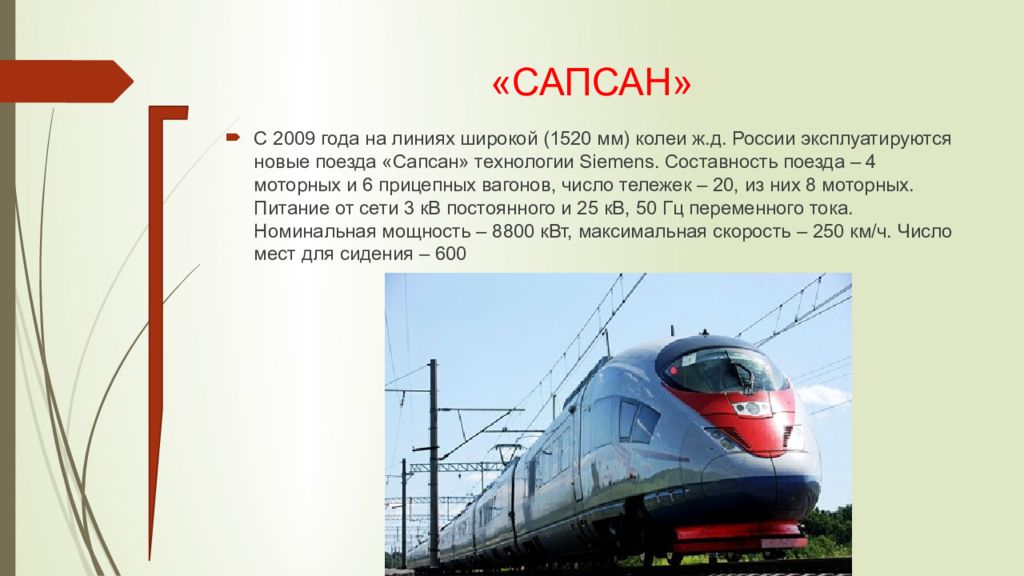 С 2009 года на линиях широкой (1520 мм) колеи ж.д. России эксплуатируются новые поезда «Сапсан» технологии Siemens. Составность поезда – 4 моторных и 6 прицепных вагонов, число тележек – 20, из них 8 моторных. Питание от сети 3 кВ постоянного и 25 кВ, 50 Гц переменного тока. Номинальная мощность – 8800 кВт, максимальная скорость – 250 км/ч. Число мест для сидения – 600