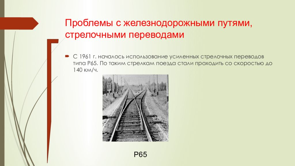 С 1961 г. началось использование усиленных стрелочных переводов типа Р65. По таким стрелкам поезда стали проходить со скоростью до 140 км/ч. Р65