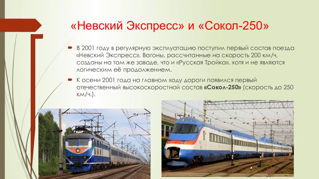 В 2001 году в регулярную эксплуатацию поступил первый состав поезда «Невский Экспресс». Вагоны, рассчитанные на скорость 200 км/ч, созданы на том же заводе, что и «Русская Тройка», хотя и не являются логическим её продолжением. К осени 2001 года на главном ходу дороги появился первый отечественный высокоскоростной состав «Сокол-250» (скорость до 250 км/ч.).