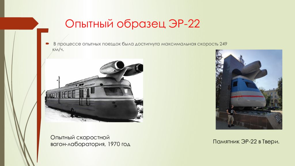В процессе опытных поездок была достигнута максимальная скорость 249 км/ч. Опытный скоростной вагон-лаборатория, 1970 год Памятник ЭР-22 в Твери.