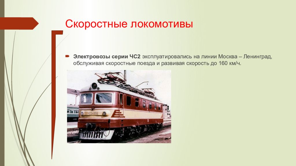Электровозы серии ЧС2 эксплуатировались на линии Москва – Ленинград, обслуживая скоростные поезда и развивая скорость до 160 км/ч.