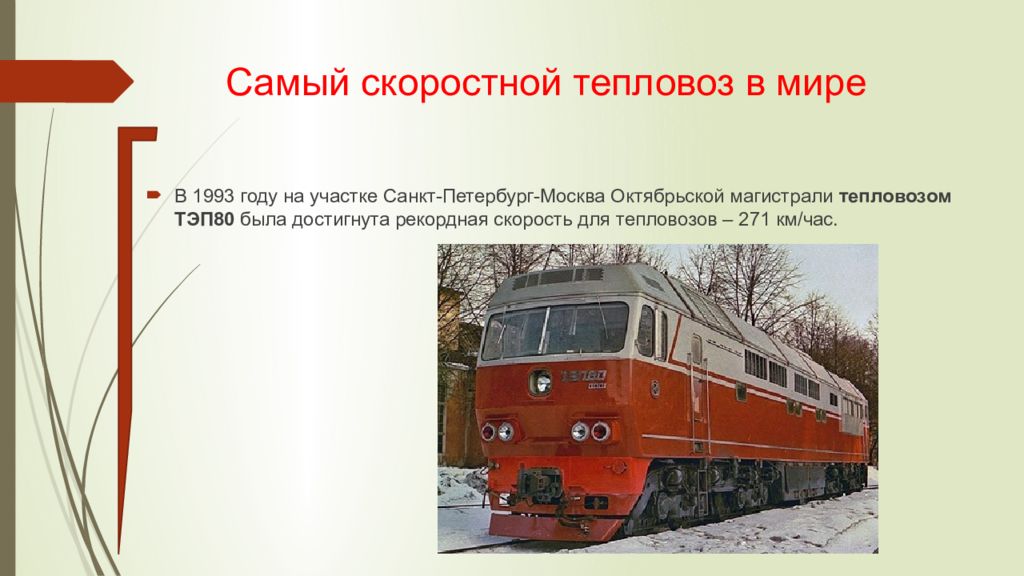 В 1993 году на участке Санкт-Петербург-Москва Октябрьской магистрали тепловозом ТЭП80 была достигнута рекордная скорость для тепловозов – 271 км/час.