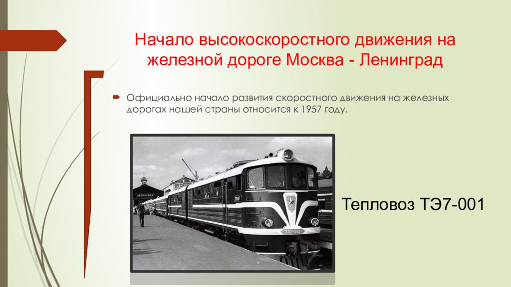 Официально начало развития скоростного движения на железных дорогах нашей страны относится к 1957 году. Тепловоз ТЭ7-001