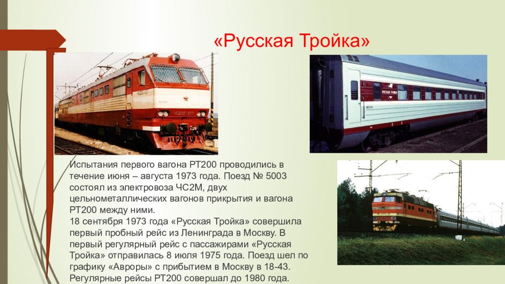Испытания первого вагона РТ200 проводились в течение июня – августа 1973 года. Поезд № 5003 состоял из электровоза ЧС2М, двух цельнометаллических вагонов прикрытия и вагона РТ200 между ними. 18 сентября 1973 года «Русская Тройка» совершила первый пробный рейс из Ленинграда в Москву. В первый регулярный рейс с пассажирами «Русская Тройка» отправилась 8 июля 1975 года. Поезд шел по графику «Авроры» с прибытием в Москву в 18-43. Регулярные рейсы РТ200 совершал до 1980 года.