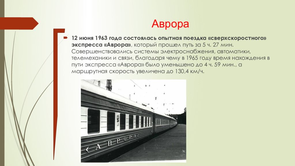 12 июня 1963 года состоялась опытная поездка «сверхскоростного» экспресса «Аврора», который прошел путь за 5 ч. 27 мин. Совершенствовались системы электроснабжения, автоматики, телемеханики и связи, благодаря чему в 1965 году время нахождения в пути экспресса «Аврора» было уменьшено до 4 ч. 59 мин., а маршрутная скорость увеличена до 130,4 км/ч.