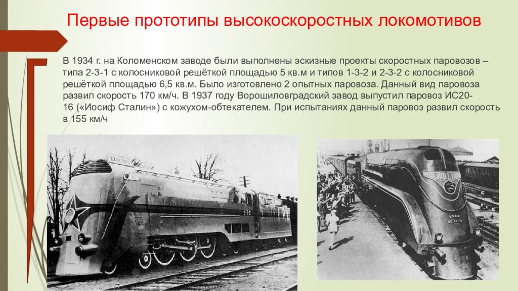 В 1934 г. на Коломенском заводе были выполнены эскизные проекты скоростных паровозов – типа 2-3-1 с колосниковой решёткой площадью 5 кв.м и типов 1-3-2 и 2-3-2 с колосниковой решёткой площадью 6,5 кв.м. Было изготовлено 2 опытных паровоза. Данный вид паровоза развил скорость 170 км/ч. В 1937 году Ворошиловградский завод выпустил паровоз ИС20-16 («Иосиф Сталин») с кожухом-обтекателем. При испытаниях данный паровоз развил скорость в 155 км/ч